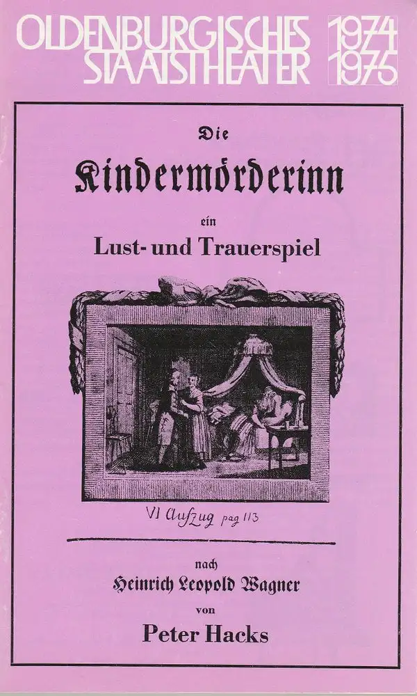 Lust- und Trauerspiel nach Heinrich Leopold Wagner. Inszenierung: Gerhard Jelen. Bühne und Kostüme: Heidrun Schmelzer. Orgel: Walter Thomas. Mitwirkende: Manfred Melz, Sigrid Zimmermann, Felicitas Wolff, Barbara Krabbe, Hannes Krüger, u. a. - Theaterprogramm, Opernprogramm, Ballettprogramm, Musicalprogramm, Konzertprogramm, Theatermemorabilia, Programmhefte Sammlung, deutsche Theatergeschichte.
