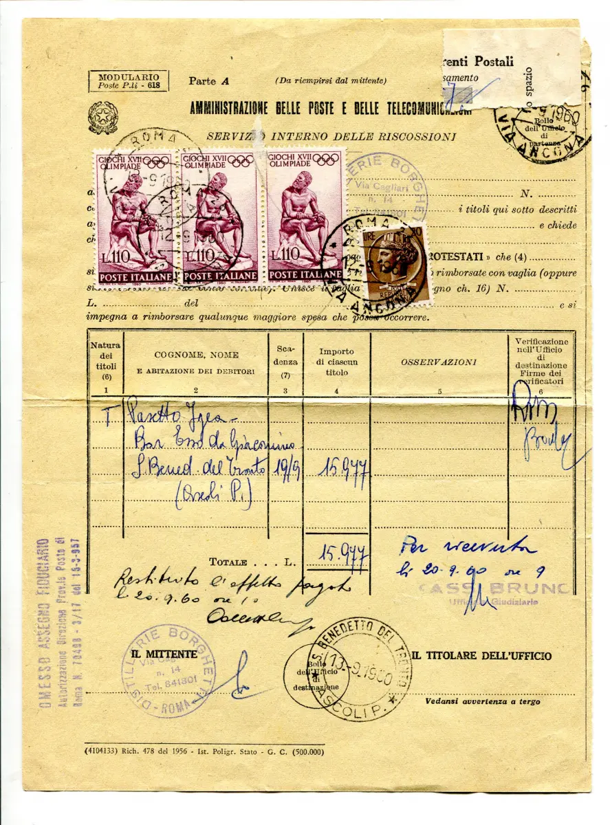 Olympische Spiele in Rom Lire 110 Dreierstreifen auf Modul - Olympische Spiele in Rom Lire 110 Nr. 891 Dreierstreifen + Ergänzung Nr. 768 verwendet auf Postformular für interne Dienst Abholung am 12.9.60 - Interessant, für Ausgabespezialisten Cod. 272/16