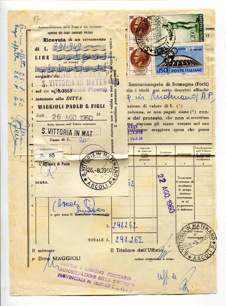 Olympische Spiele in Rom Lire 150 Nr. 892 auf Formular - Olympische Spiele in Rom Lire 150 Nr. 892 (mit weißer Zeile auf dem Boden) + Ergänzungen Nr. 873 x 2 + Lire 200 Nr. 893 verwendet auf Postformular für interne Abhebungen am 16.8.60 - Interessant, für Ausgabespezialisten Cod. 274/16
