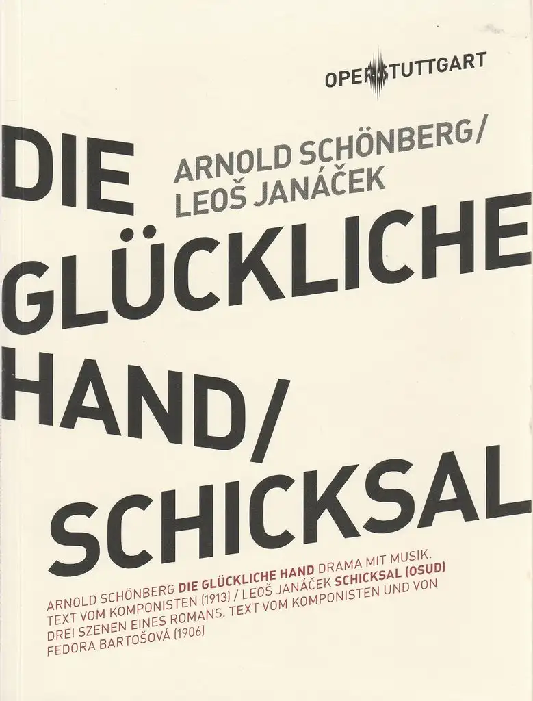 Musikalische Leitung: Sylvain Cambreling, Regie und Dramaturgie: Jossi Wieler, Sergio Morabito. Bühne: Bert Neumann. Kostüme: Nina von Mechow. DIE GLÜCKLICHE HAND: Drama mit Musik. Mitwirkende: Shigeo Ishino, Mitglieder des Staatsopernchores. SCHICKSAL: Drei Szenen eines Romans. Mitwirkende: John Graham-Hall, Rebecca von Lipinski, Rosalind Plowright, Heinz Göring, Maja Tabatadze, Karin Horvat, u. a. - Theaterprogramm, Opernprogramm, Ballettprogramm, Musicalprogramm, Konzertprogramm, Theatermemorabilia, Programmhefte Sammlung, deutsche Theatergeschichte.
