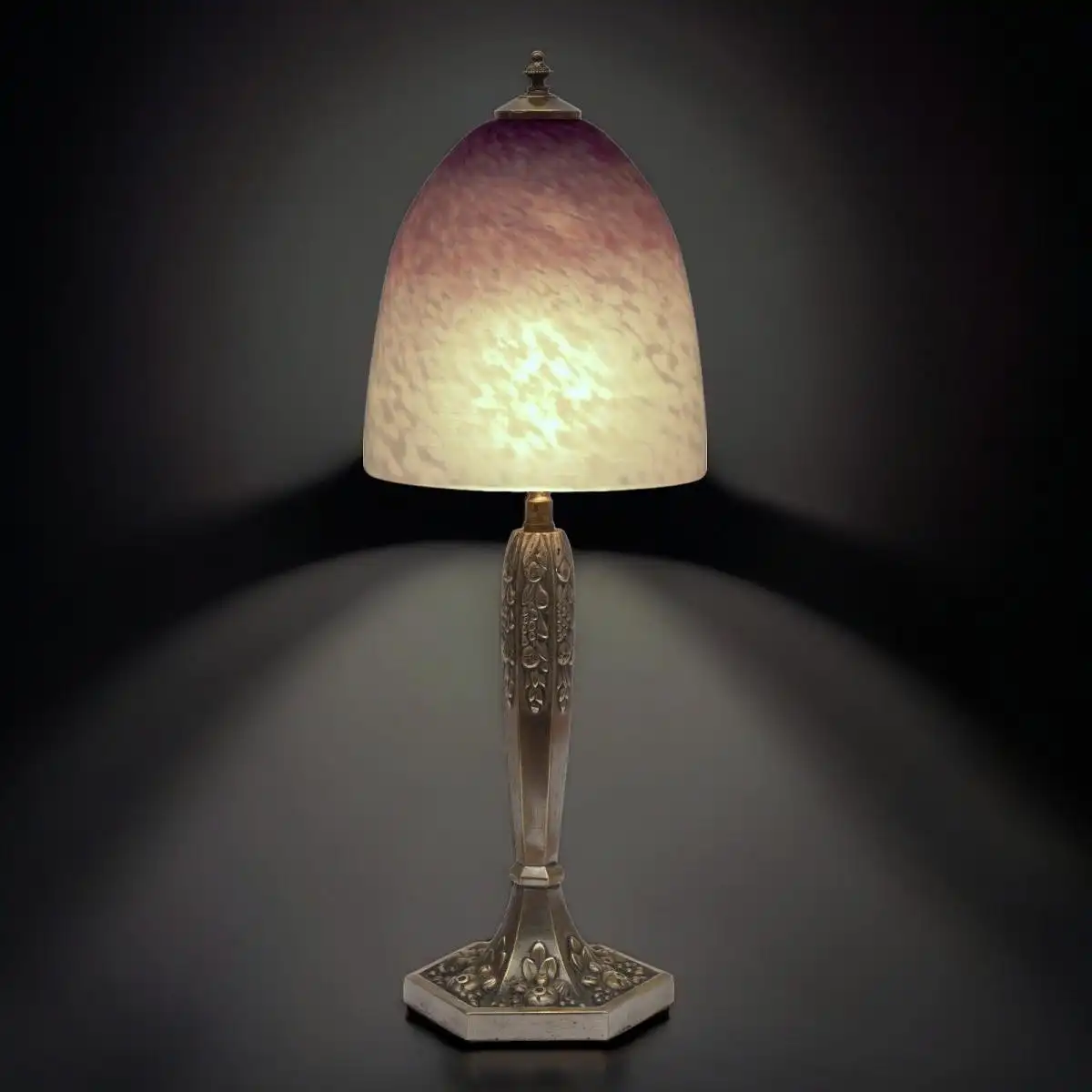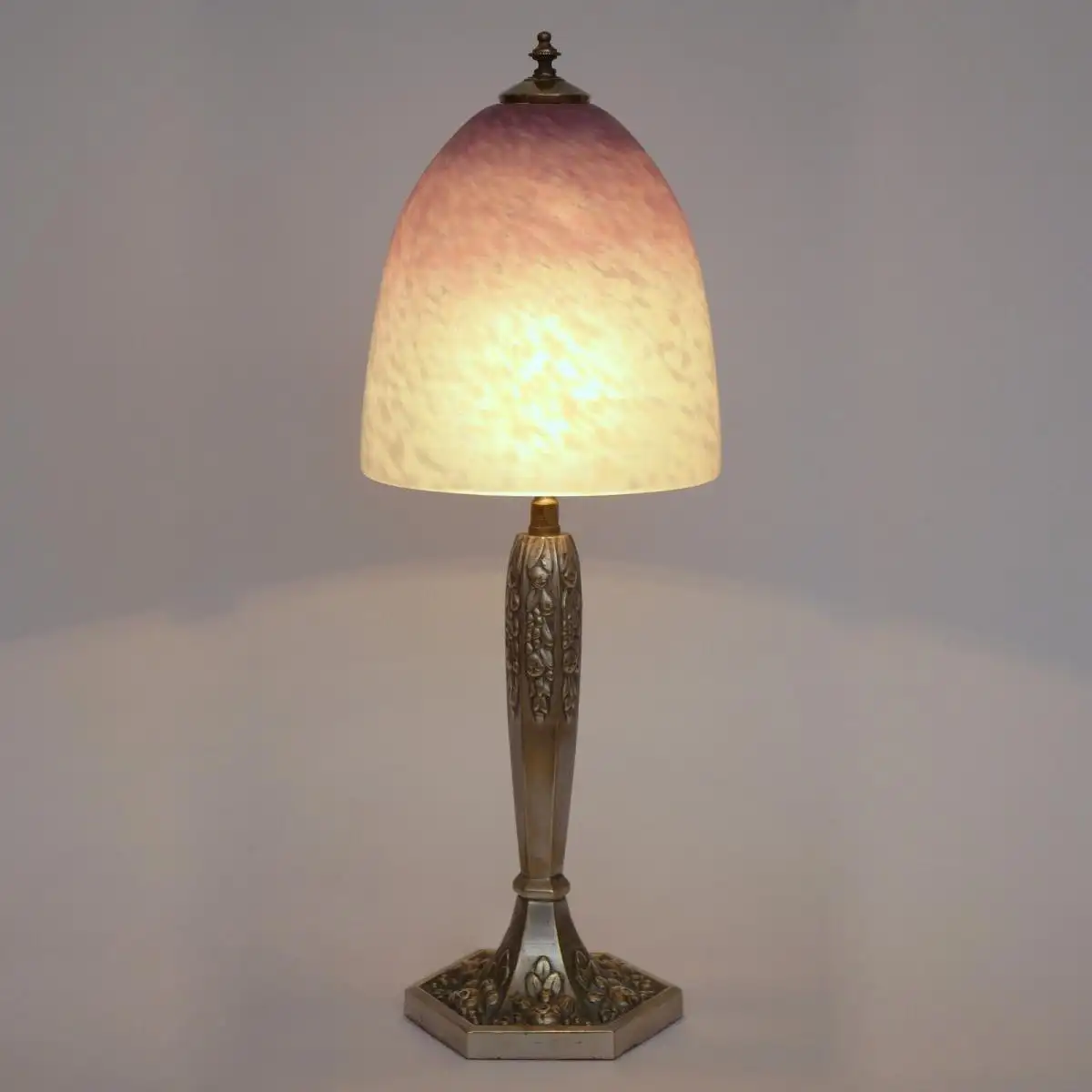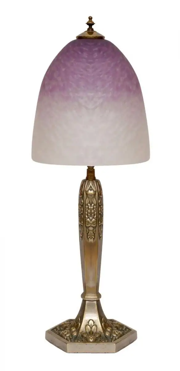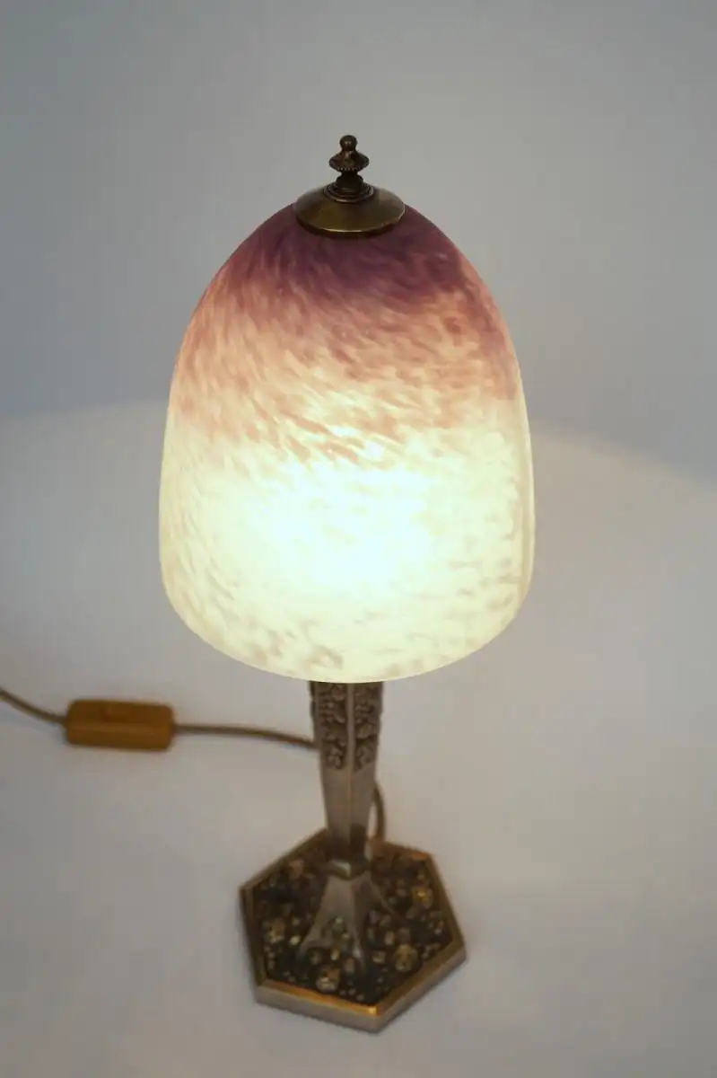 Original Art Déco Tischlampe "VIOLET".\nFrankreich, 1920er Jahre.\nVernickelte, jedoch stark beriebene Messing-Bronze-Montur.\nOriginal Pate de Verre Glas, satiniert mit einzigartiger Lichtwirkung.Komplett erneuerte Elektrik.\nPVC-Zuleitung mit Schnur-Zwischenschalter. \nFranzösische original B15 Bajonett-Fassung, bis max. 40 Watt - Leuchtmittel online überall erhältlich.\nGesamthöhe ca. 43 cm. Schirmdurchmesser ca. 15 cm. \nDie Leuchte weist insgesamt deutlich sichtbare Alters- & Gebrauchsspuren auf - dies ist keine neue Lampe!\nKleinteile wie Schrauben oder Unterlegscheiben wurden erneuert.\n