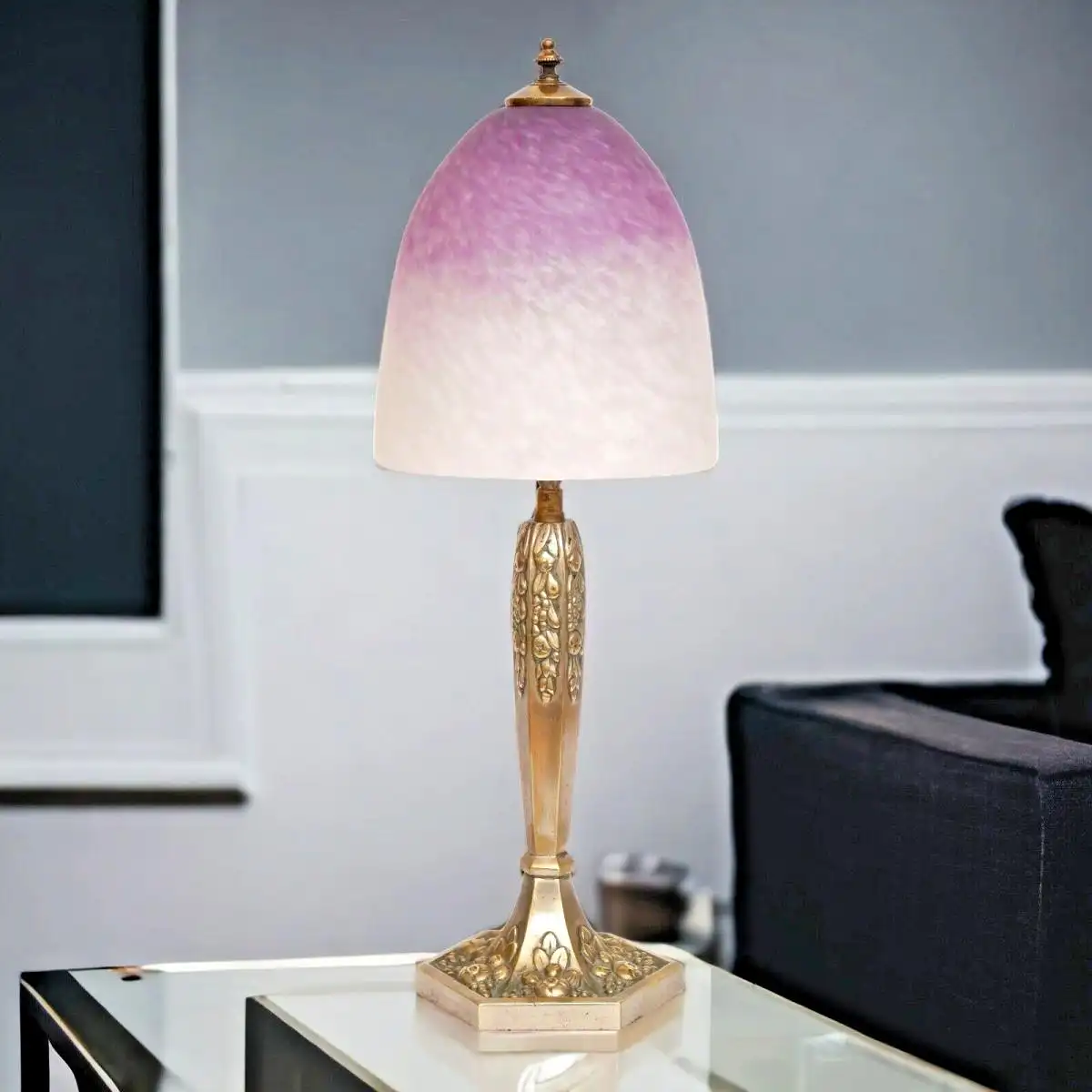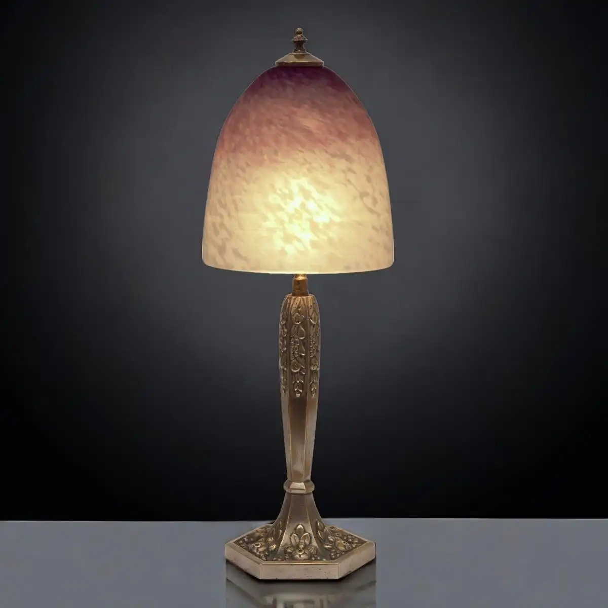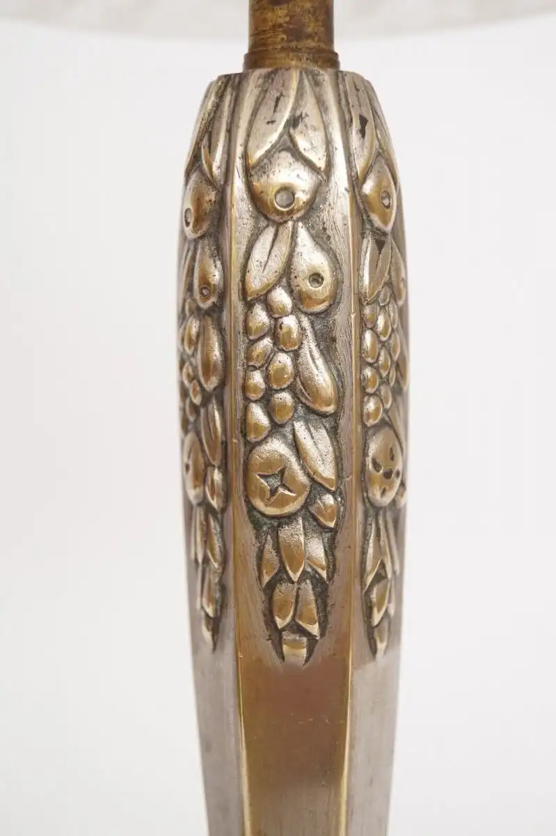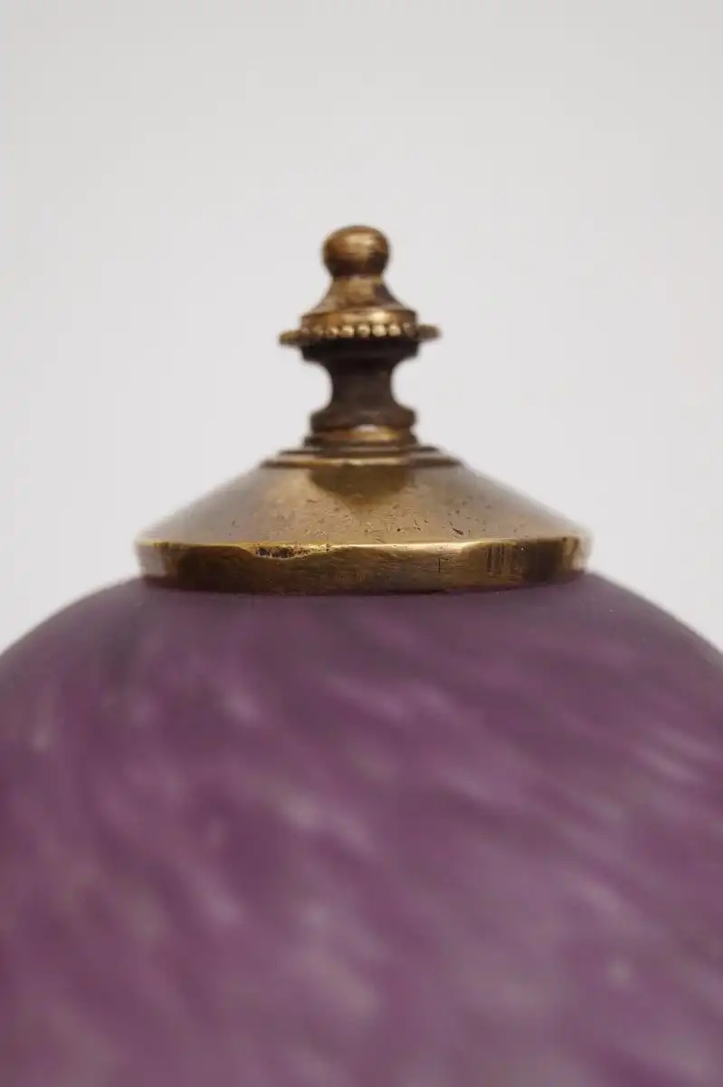 Original Art Déco Tischlampe "VIOLET".\nFrankreich, 1920er Jahre.\nVernickelte, jedoch stark beriebene Messing-Bronze-Montur.\nOriginal Pate de Verre Glas, satiniert mit einzigartiger Lichtwirkung.Komplett erneuerte Elektrik.\nPVC-Zuleitung mit Schnur-Zwischenschalter. \nFranzösische original B15 Bajonett-Fassung, bis max. 40 Watt - Leuchtmittel online überall erhältlich.\nGesamthöhe ca. 43 cm. Schirmdurchmesser ca. 15 cm. \nDie Leuchte weist insgesamt deutlich sichtbare Alters- & Gebrauchsspuren auf - dies ist keine neue Lampe!\nKleinteile wie Schrauben oder Unterlegscheiben wurden erneuert.\n