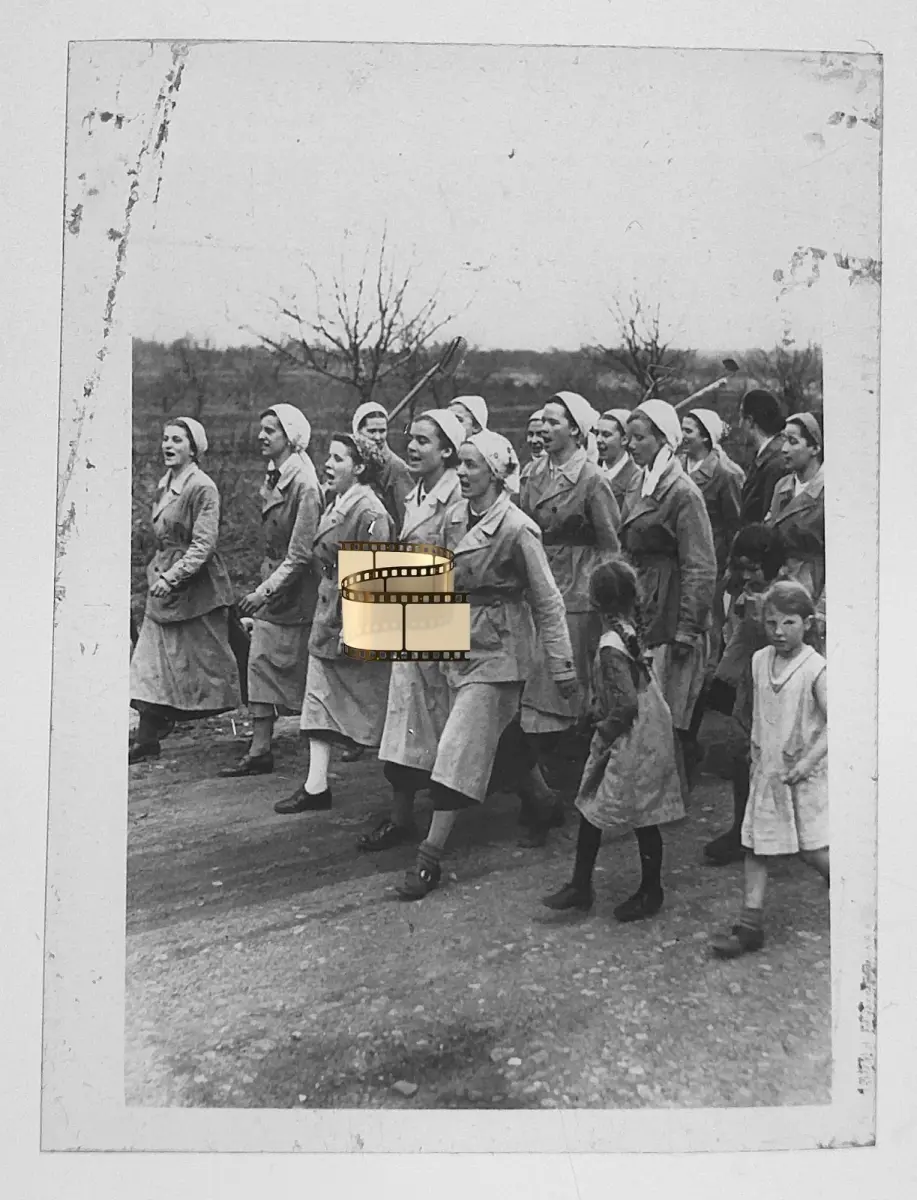 Original Dia 4x3,5cm - weibliche Landjahr-Mädchen marschieren zum Arbeitsplatz