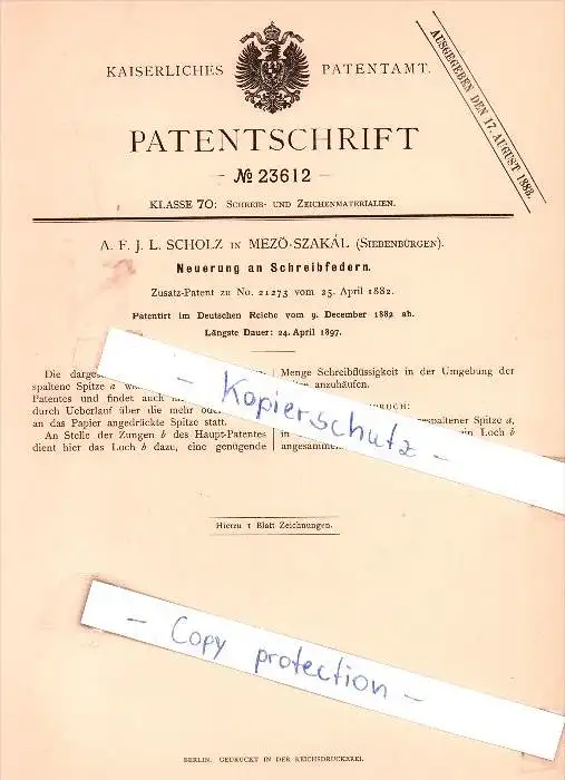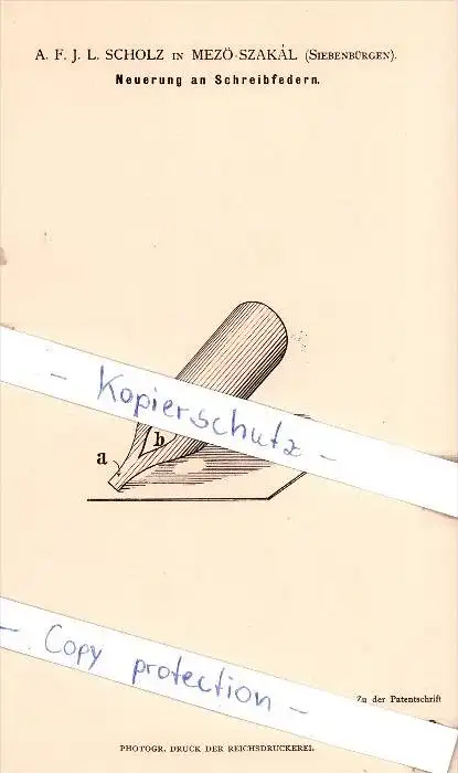Original Patent - A. F. J. L. Scholz in Mezö-Szakal , Siebenbürgen , 1882 , Neuerung an Schreibfedern !!!