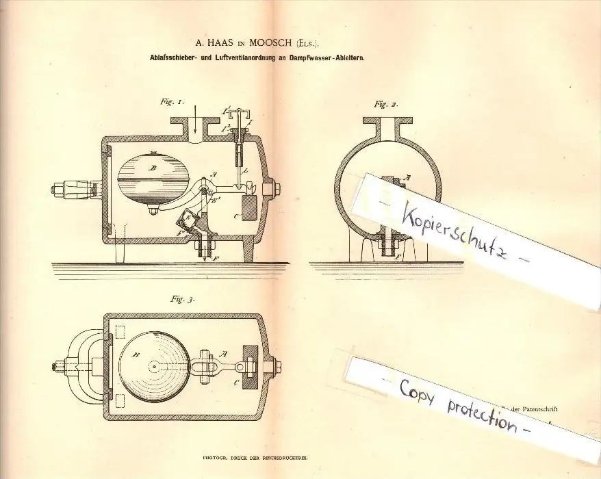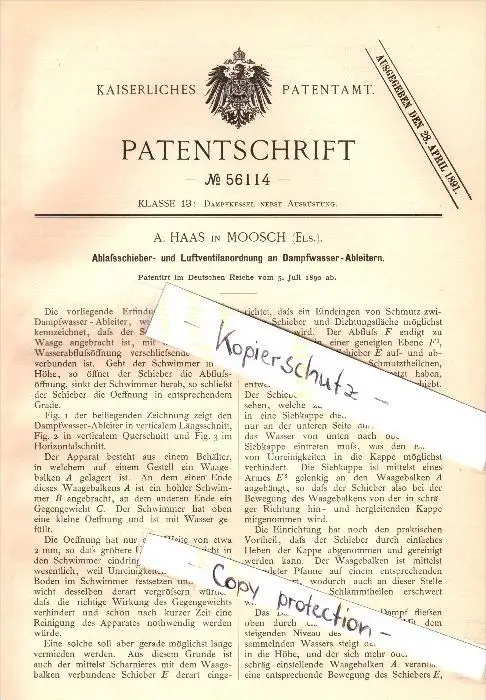 Original Patent - A. Haas à Moosch , 1890 , Dispositif de soupape pour moteur à vapeur , Elsass , Alsace !!!