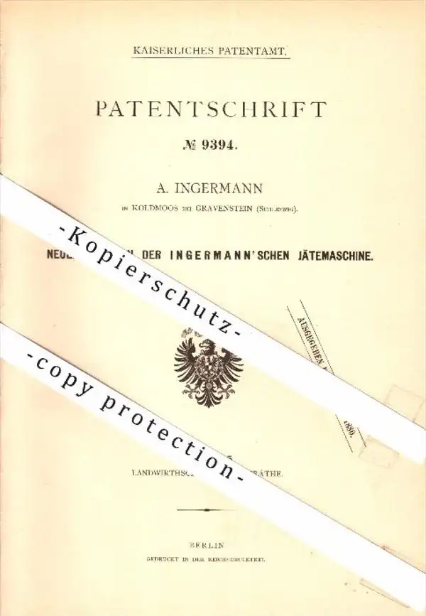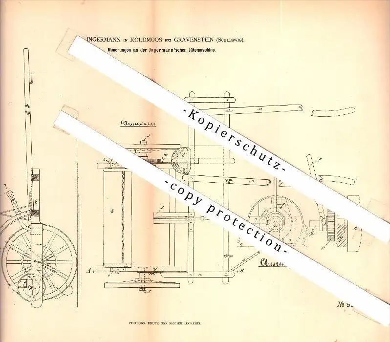 Original Patent - A. Ingermann in Koldmoos b. Gravenstein / Grasten , 1879 , Jätemaschine , Agrar , Dänemark !!!