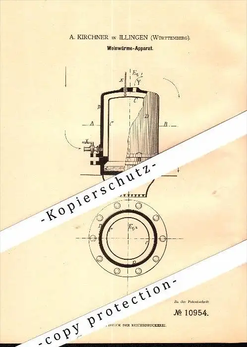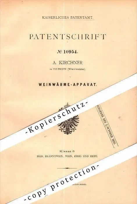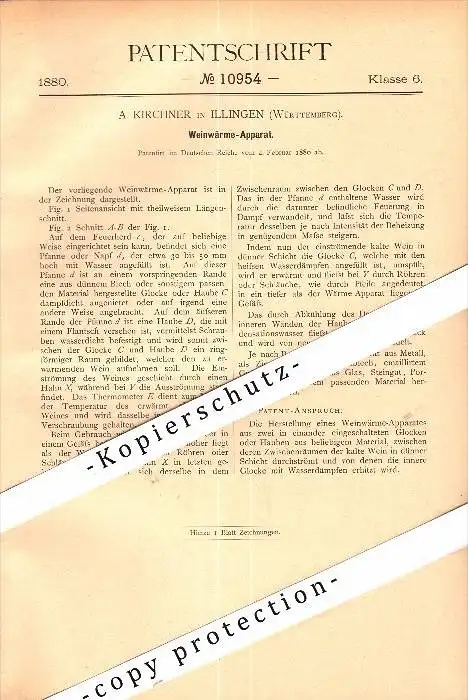 Original Patent - A. Kirchner in Illingen , Württemberg , 1880 , Wein - Wärmeapparat , Weinbau , Brauerei , Brennerei !!