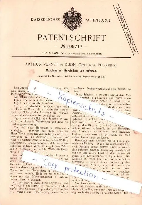 Original Patent - A. Vernet in Dijon , Cote D`or, Frankreich , 1898 , Herstellung von Hufeisen !!!