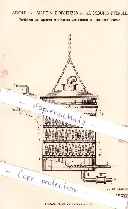 Original Patent - A. und M. Koblenzer in Augsburg-Pfersee , 1890 , Färben von Garnen in Cobs !!!