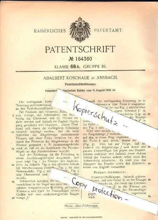 Original Patent - Adalbert Koschade in Ansbach , 1906 , Fenster-Schließklampe , Fensterbau !!!