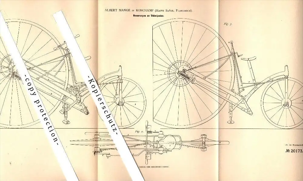 Original Patent - Albert Mange à Ronchamp , Haute Saone , 1882 , Innovation sur les bicyclettes , bicycle !!!