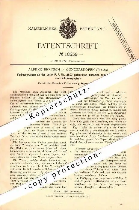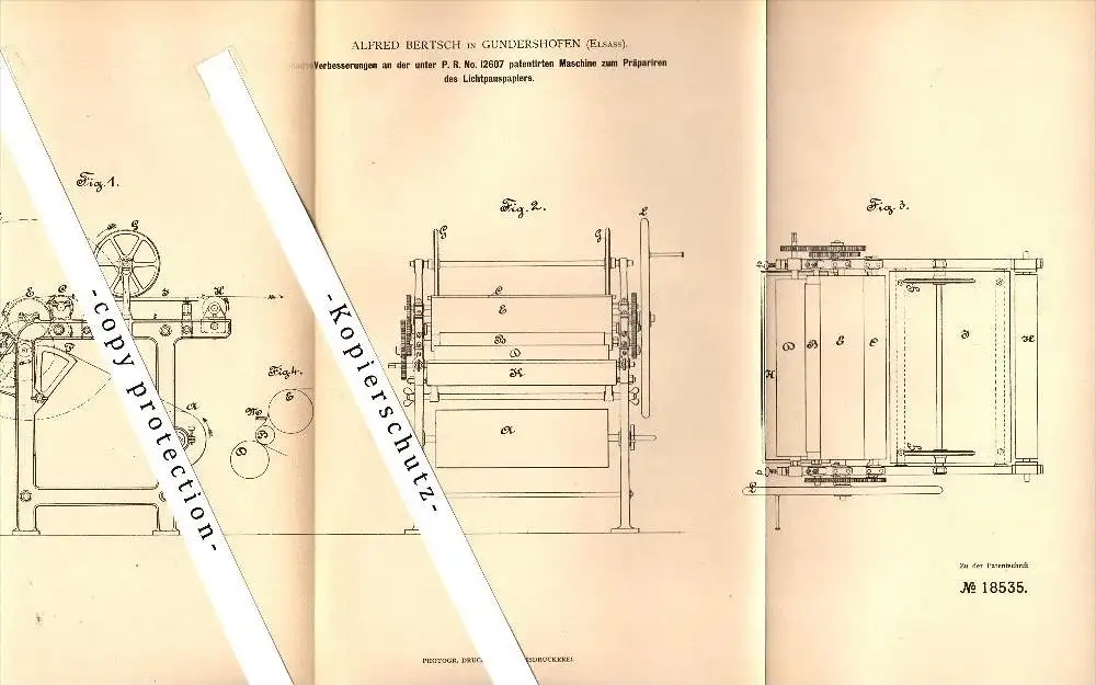 Original Patent - Alfred Bertsch à Gundershoffen , 1881 , Machine pour la préparation du papier , photographie !!!