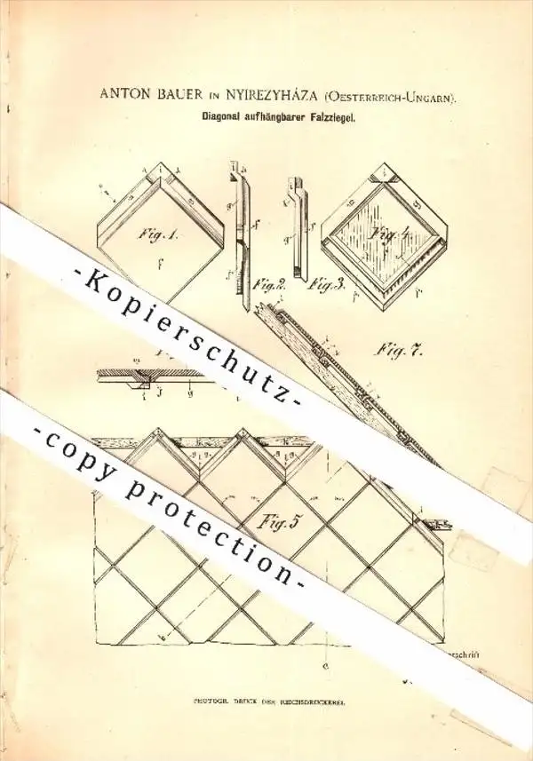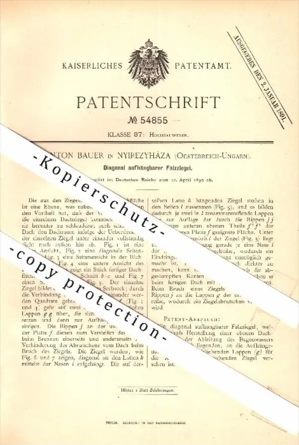 Original Patent - Anton Bauer in Nyiregyháza / Birkenkirchen , Ungarn , 1890 , Falzziegel , Dachziegel , Dachdecker !!!