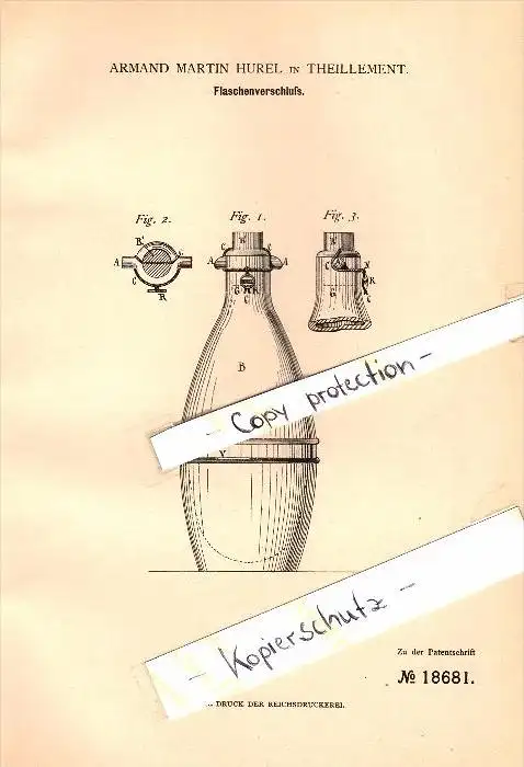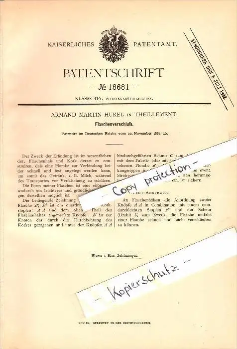 Original Patent - Armand Martin Hurel à Theillement , Eure , 1881 , bouchon !!!