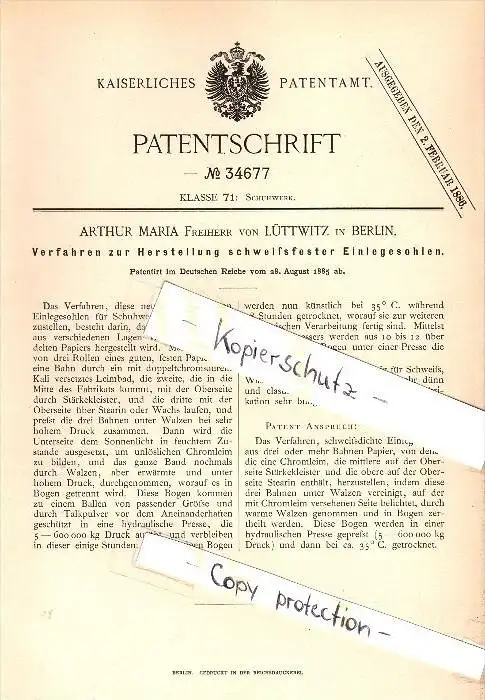 Original Patent - Arthur Maria Freiherr von Lüttwitz in Berlin , 1885 , schweißfeste Einlegesohlen , Schuhmacher !!!