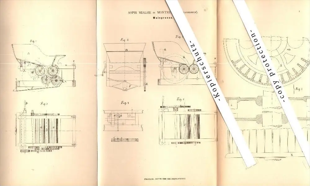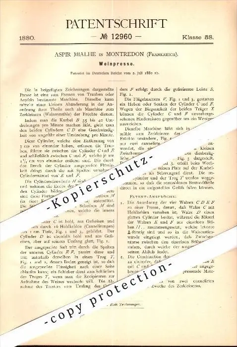 Original Patent - Aspir Mialhe à Montredon , 1880 , pressoir , Vin , Vino !!!