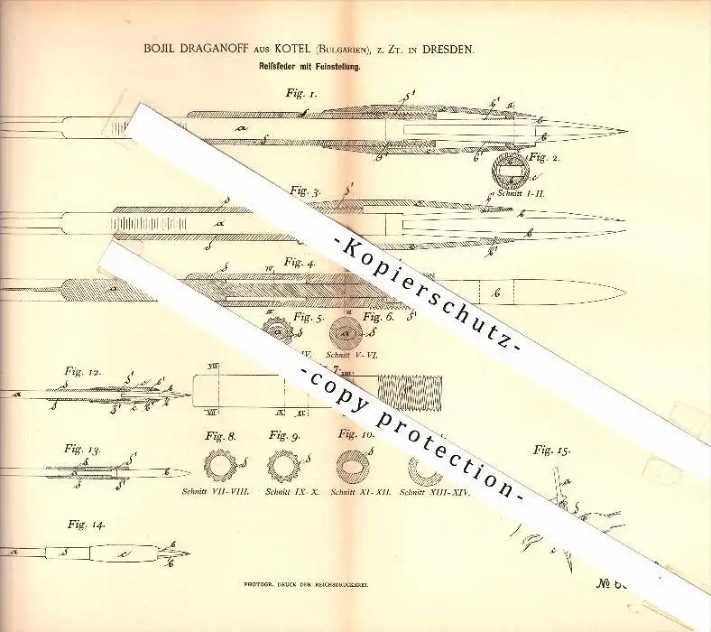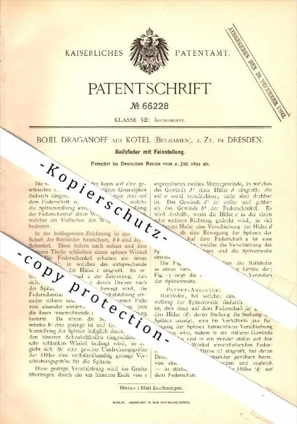 Original Patent - Bojil Draganoff aus Kotel / Bulgarien , z.Zt. Dresden , 1892 , Reißfeder mit Feinstellung , Sliwen !!!