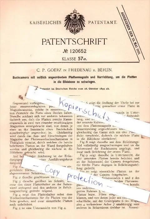 Original Patent - C. P. Goerz in Friedenau b. Berlin , 1899 , Buchcamera mit Plattenmagazin !!!