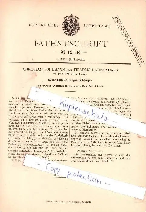 Original Patent - C. Pohlmann und F. Niesenhaus in Essen a. d. Ruhr , 1880 , Bergbau !!!