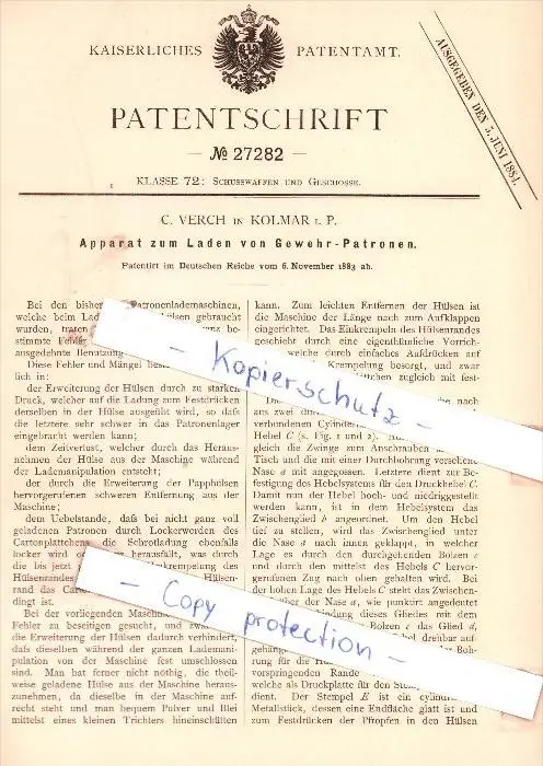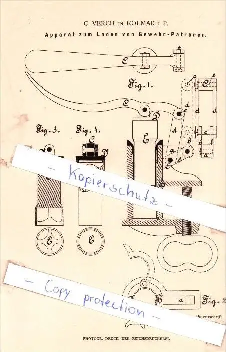 Original Patent - C. Verch in Kolmar i. P. , 1883 , Apparat zum Laden von Gewehr-Patronen !!!