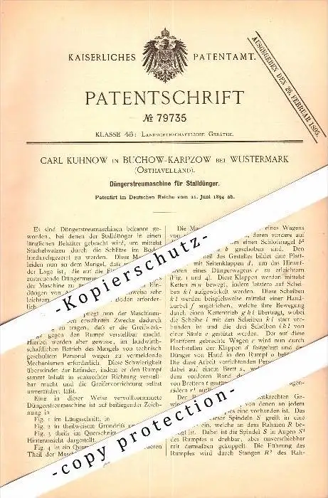 Original Patent - Carl Kuhnow in Buchow-Karpzow b. Wustermark , 1894 , Düngerstreumaschine für Stalldünger , Agrar !!!