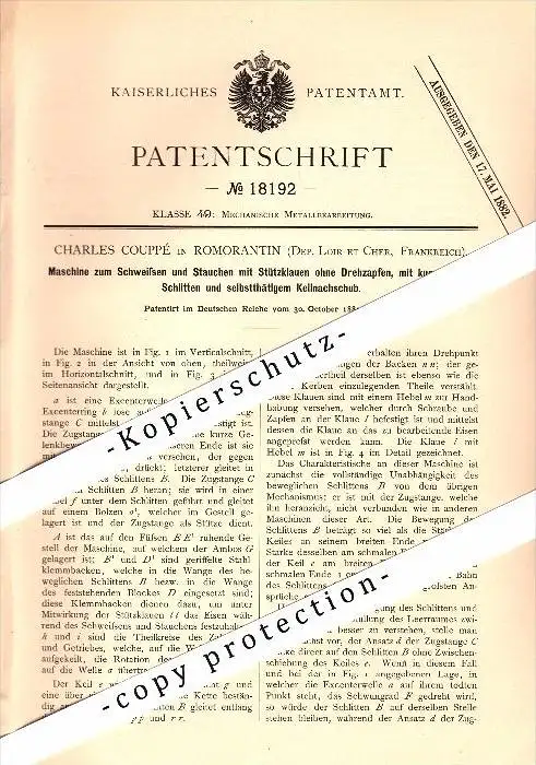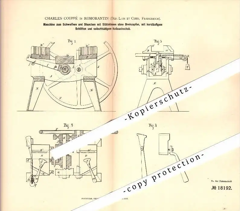 Original Patent - Charles Couppé à Romorantin , Loir et Cher , 1881 , Machine pour le soudage et bouleversant !!!