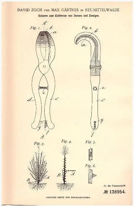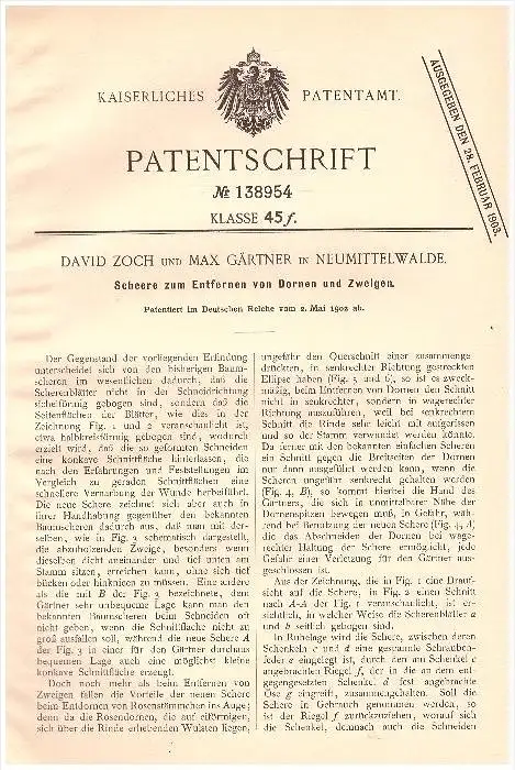 Original Patent - D. Zoch und Max Gärtner in Neumittelwalde , 1902 , Scheere für Dornen , Pflanzen , Międzybórz !!!