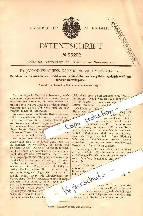 Original Patent - Dr. Johannes Kappers in Hoogezand-Sappemeer , 1883 , Fabrikation von Tierfutter , Groningen !!!
