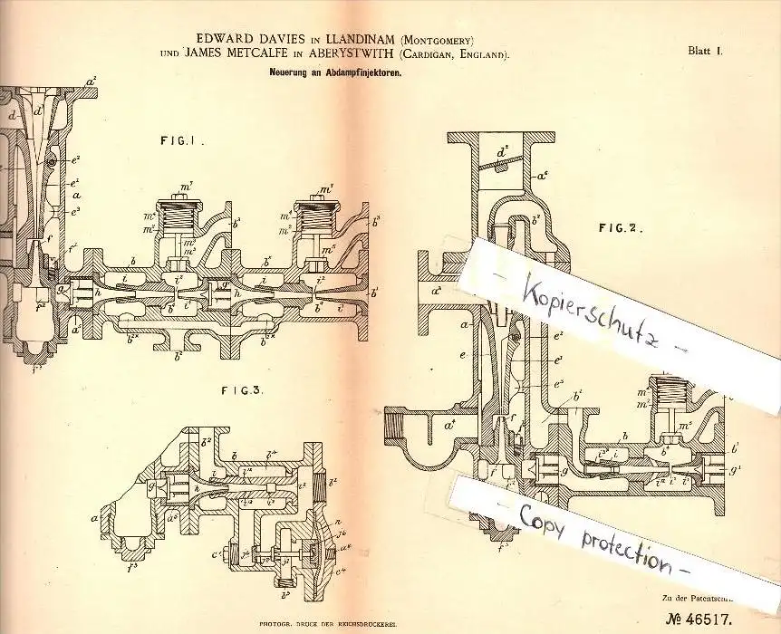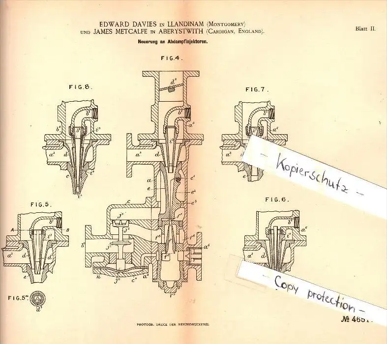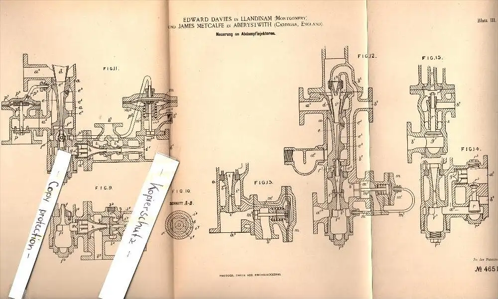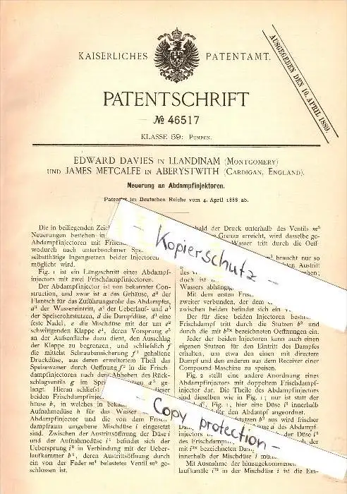 Original Patent - E. Davies in Llandinam / Llanidloes and James Metcalfe in Aberystwyth , 1888 , steam injectors , pump