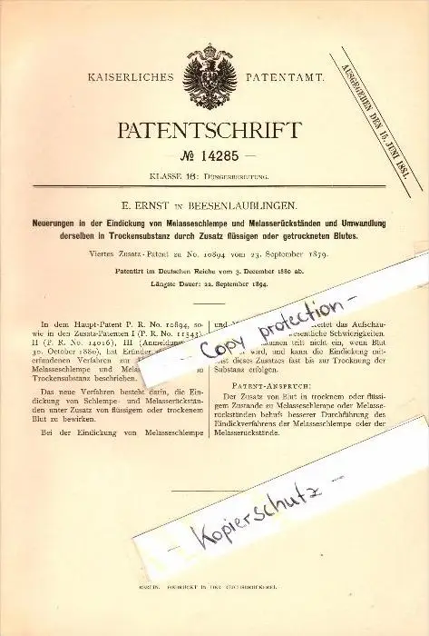 Original Patent - E. Ernst in Beesenlaublingen b. Könnern , 1880 , Eindickung von Melasseschlempe mit Blut !!!