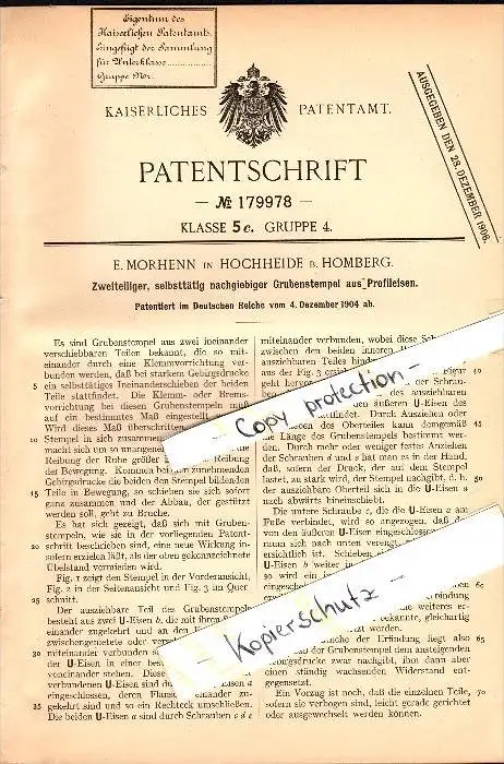 Original Patent - E. Morhenn in Hochheide b. Homburg , 1904 , Grubenstempel aus Profileisen , Grube . Zeche , Bergbau !!