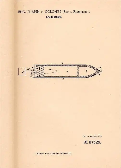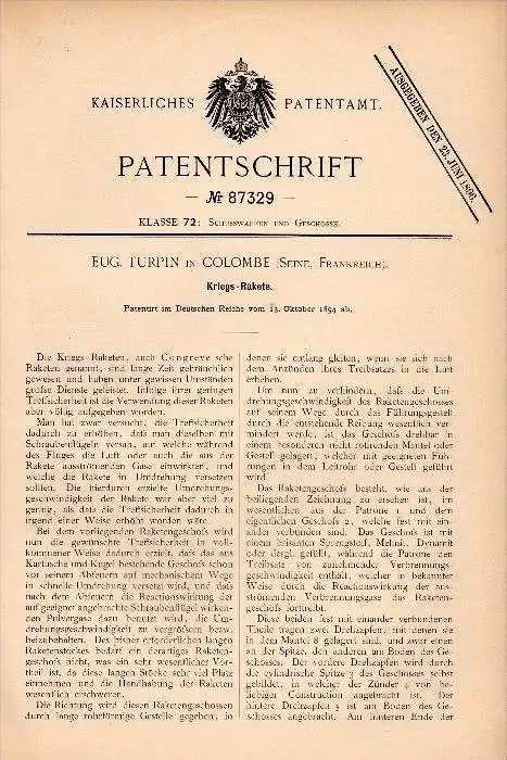 Original Patent - E. Turpin dans Sainte Colombe sur Seine , 1894 , Rocket guerre , arme !!!