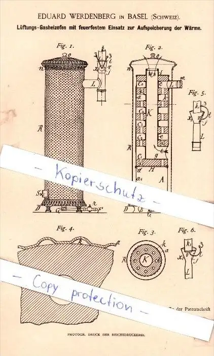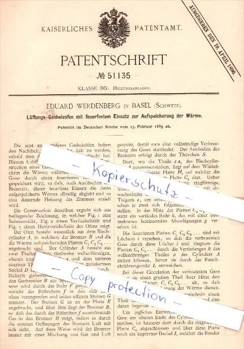 Original Patent - E. Werdenberg in Basel , Schweiz , 1889 , Lüftungs-Gasheizofen mit Einsatz !!!