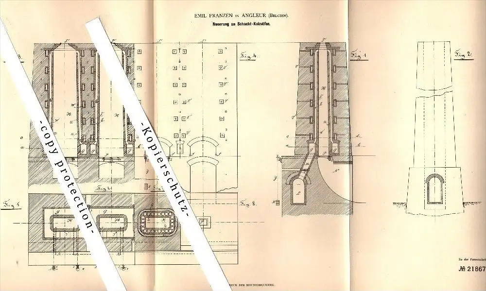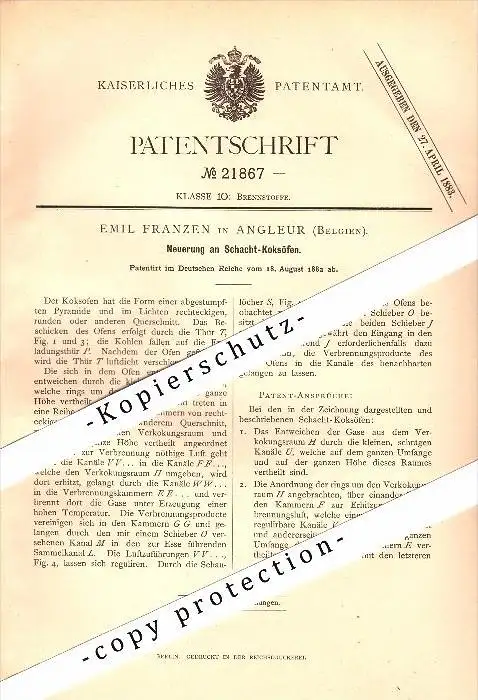 Original Patent - Emil Franzen in Angleur b. Lüttich / Liége , 1882 , Schacht-Koksofen !!!