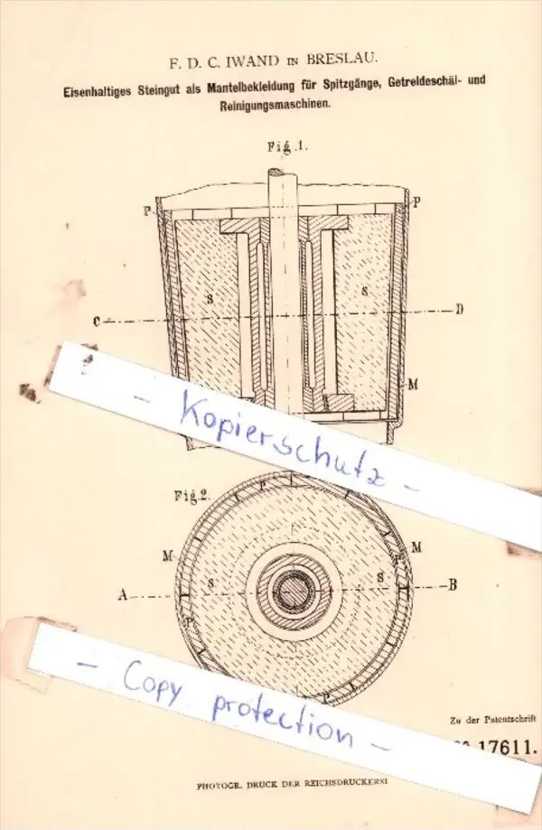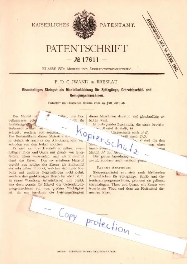 Original Patent - F. D. C. Iwand in Breslau , 1881 , Mühlen- und Zerkleinerungsmaschinen !!!