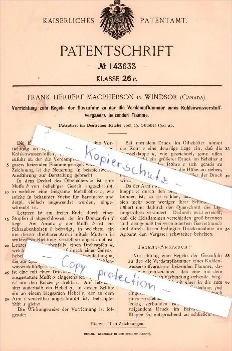 Original Patent - F. H. Macpherson in Windsor , Canada , 1901 , Regeln der Gaszufuhr !!!