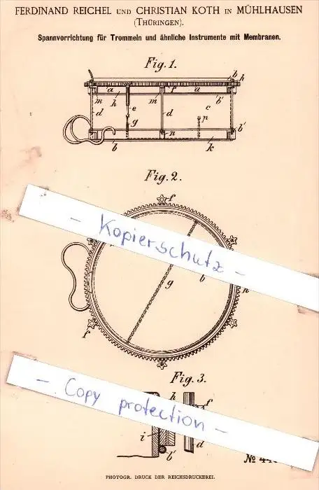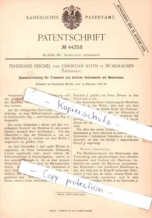 Original Patent - F. Reichel und C. Koth in Mühlhausen , Thüringen , 1888 , !!!
