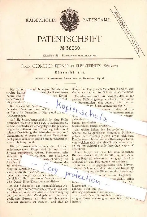 Original Patent - Firma Gebrüder Perner in Elbe - Teinitz / Tynec nad Labem , 1885 , Röhrenbürste !!!