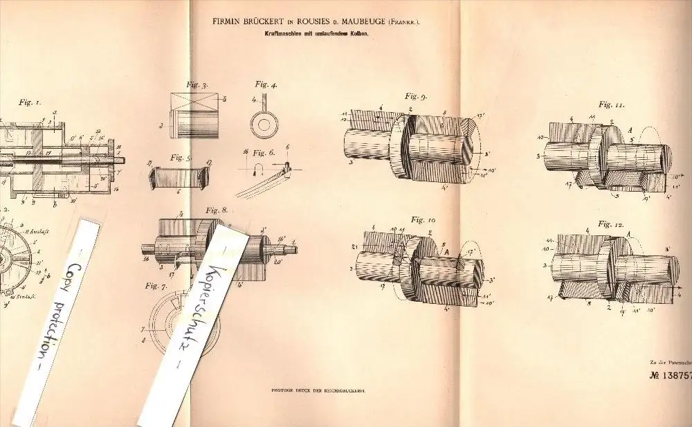 Original Patent - Firmin Brückert à Rousies b. Maubeuge , 1900 , Moteur à combustion avec tous azimuts piston !!!