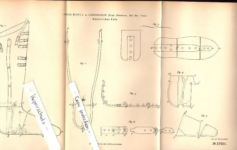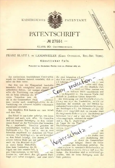 Original Patent - Franz Blatt in Landsweiler b. Lebach , 1883 , künstlicher Fuß , Prothese !!!