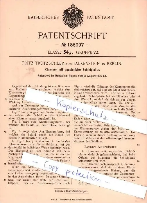 Original Patent - Fritz Trützschler von Falkenstein in Berlin , 1906 , Klammer mit Schildplatte !!!