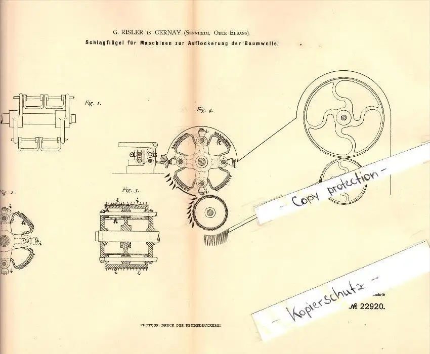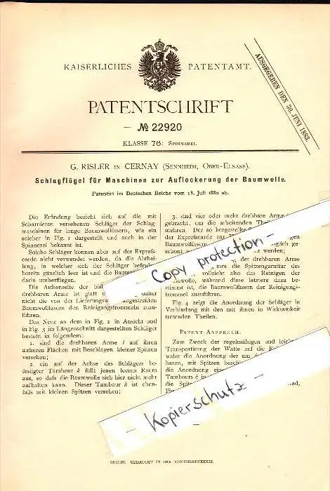 Original Patent - G. Risler à Cernay / Sennheim , 1882 , Machine pour le coton !!!