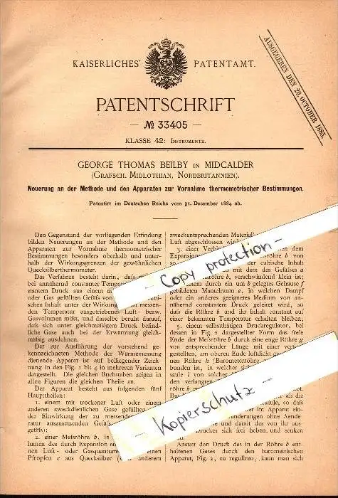 Original Patent - G.Th. Beilby in Mid Calder / Mid Cauder , 1884 , Apparatus for thermometric determination , Scotland !