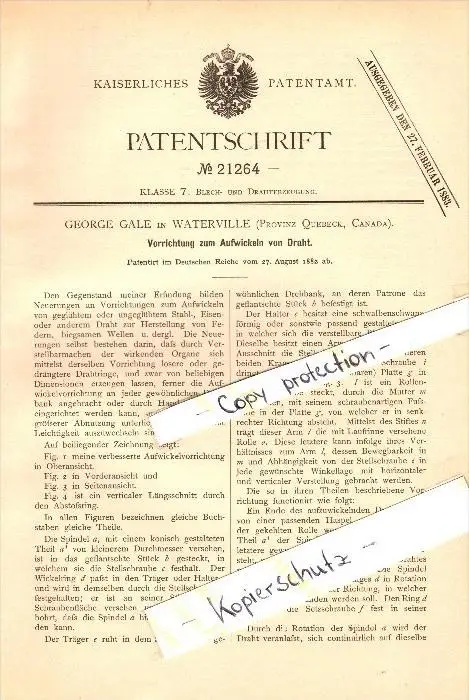 Original Patent - George Gale in Waterville , Provinz Quebec , 1882 , Apparatus for winding wire !!!