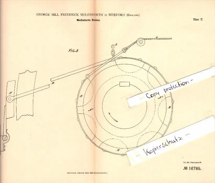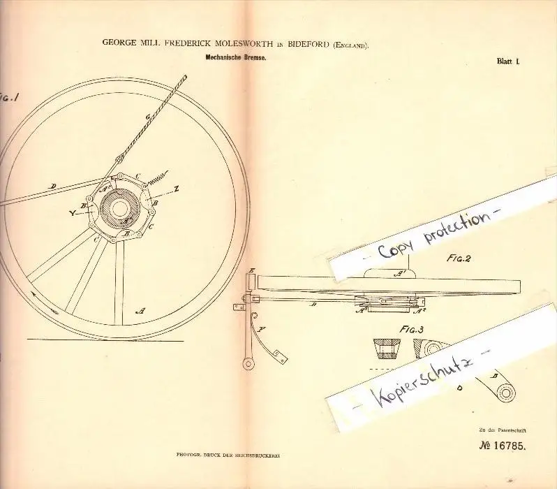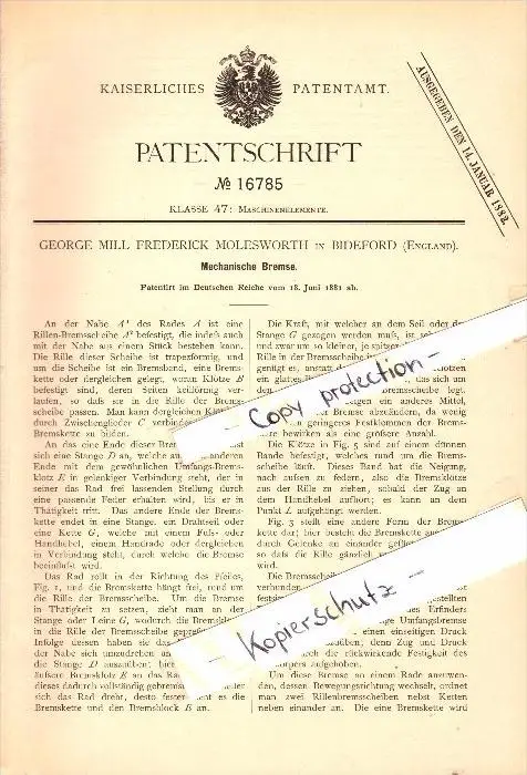 Original Patent - George M.F. Molesworth in Bideford , Devon , 1881 , mechanical brake !!!