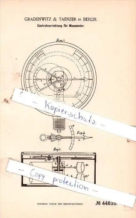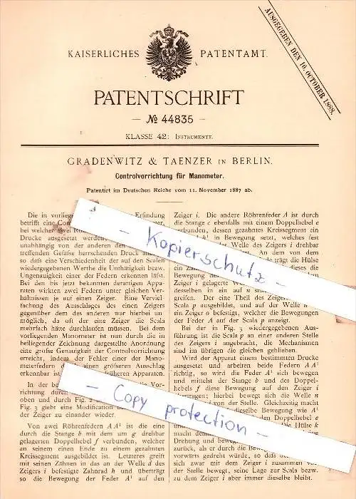 Original Patent - Gradenwitz & Taenzer in Berlin , 1887 , Controlvorrichtung für Manometer !!!