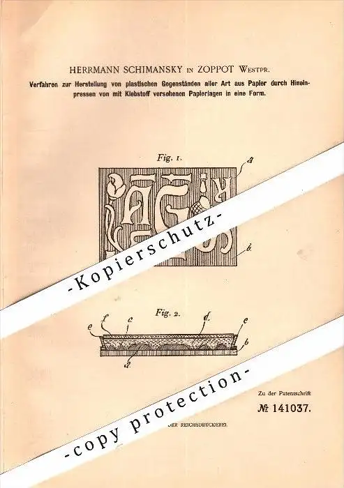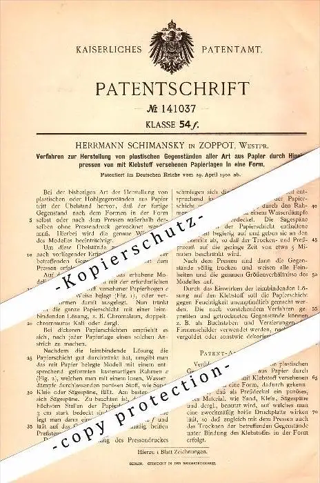 Original Patent - H. Schimansky in Zoppot / Sopot , Westpreussen , 1902 , Herstellung plastischer Gegenstände , Plastik