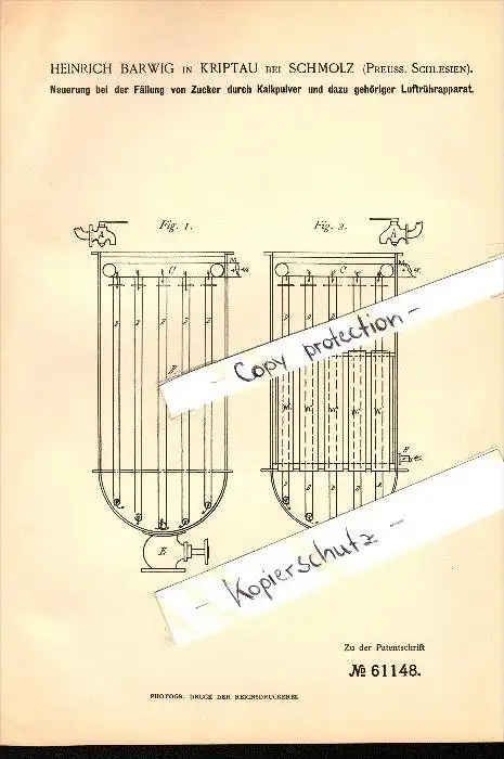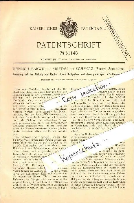 Original Patent - Heinrich Barwig in Kriptau / Krzeptów b. Schmolz / Smolec , 1890, Apparat für Zuckerfabrik , Schlesien