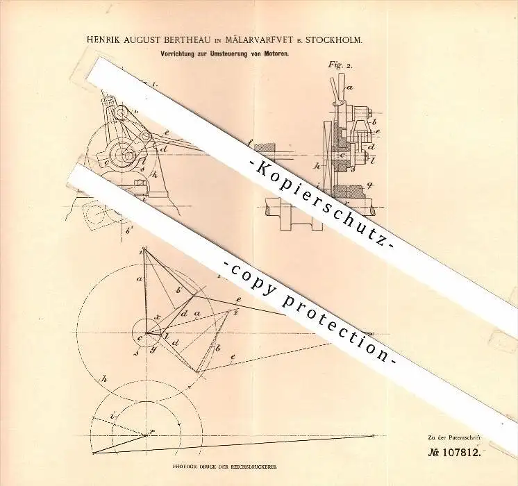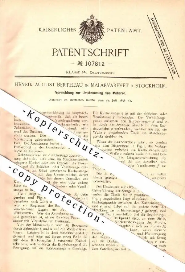 Original Patent - Henrik August Bertheau in Mälarvarvet b. Stockholm , 1898 , Steuerung von Motoren !!!