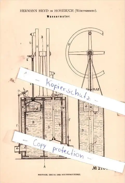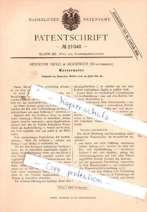 Original Patent - Hermann Heyd in Hohebuch b. Waldenburg , Württemberg , 1882 , Wassermotor !!!